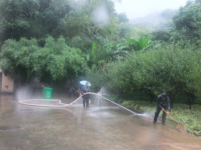 7日凌晨的23号强台风“菲特”给杭城带来了强暴雨,东岳服务中心负责人冒雨赶到东岳校区,与部门同事一起检查楼宇周边沿山排水沟的排水情况,仔细检查出口涵洞有没有被山水冲下来的树木杂草挡住,楼顶有没有积水,最大限度地消除安全隐患。由于雨量大,校区地势特殊,排水压力非常大,为确保万无一失,中心临时决定在围墙挖洞,以利雨水顺利排出。因国庆前各教学楼、学生宿舍楼楼顶都进行过排查清理,此次台风几乎没有出现楼顶下水管堵塞及墙体渗漏情况。下午5点,校党委副书记金一斌一行冒雨亲临东岳校区,对进一步做好抗台抗洪,保证正常的教学秩序和学生正常的学习生活环境作了布置。