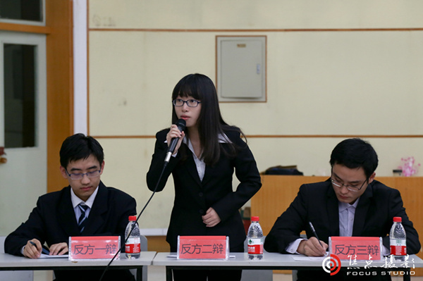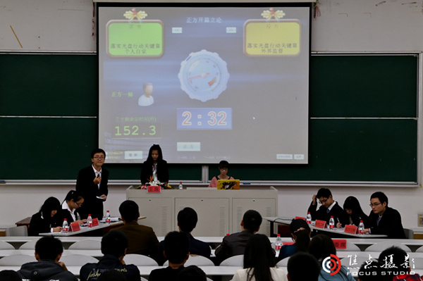 本次辩论赛的辩题围绕“落实光盘行动关键在于个人自觉还是外界监督”以及“食品领域是否应该设立免检产品”展开。校辩论队的队员将辩论赛的对抗性与表演性进行了充分的结合,一边是争锋相对,一边是步步紧逼,现场气氛迅速升温,达到白热化阶段;正反双方辩手清晰的思路和巧妙的陈词给观众留下了深刻印象,向同学们呈现了一场紧张却不失幽默的辩论赛。