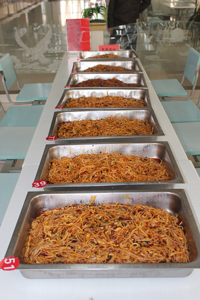 各比赛项目都分组进行,环节紧凑,高潮迭起。每位参赛队员都是经过本部门层层选拔的精英。 “台上一分钟 台下十年功”,赛场上各选手展现的娴熟技艺、精湛的刀功、高水平的厨艺水平令人叹服;色、香、形、味俱佳的创新面点,得到评委的一致认可。经过两天的激烈角逐:第三餐厅的王淑珍获初加工一等奖,第六餐厅的秦杰获切配比赛一等奖,第六餐厅的的任春分获烹饪和收银比赛一等奖,教工餐厅的夏艳霞获面点比赛一等奖,第六餐厅的郑翠玉获打饭比赛一等奖。