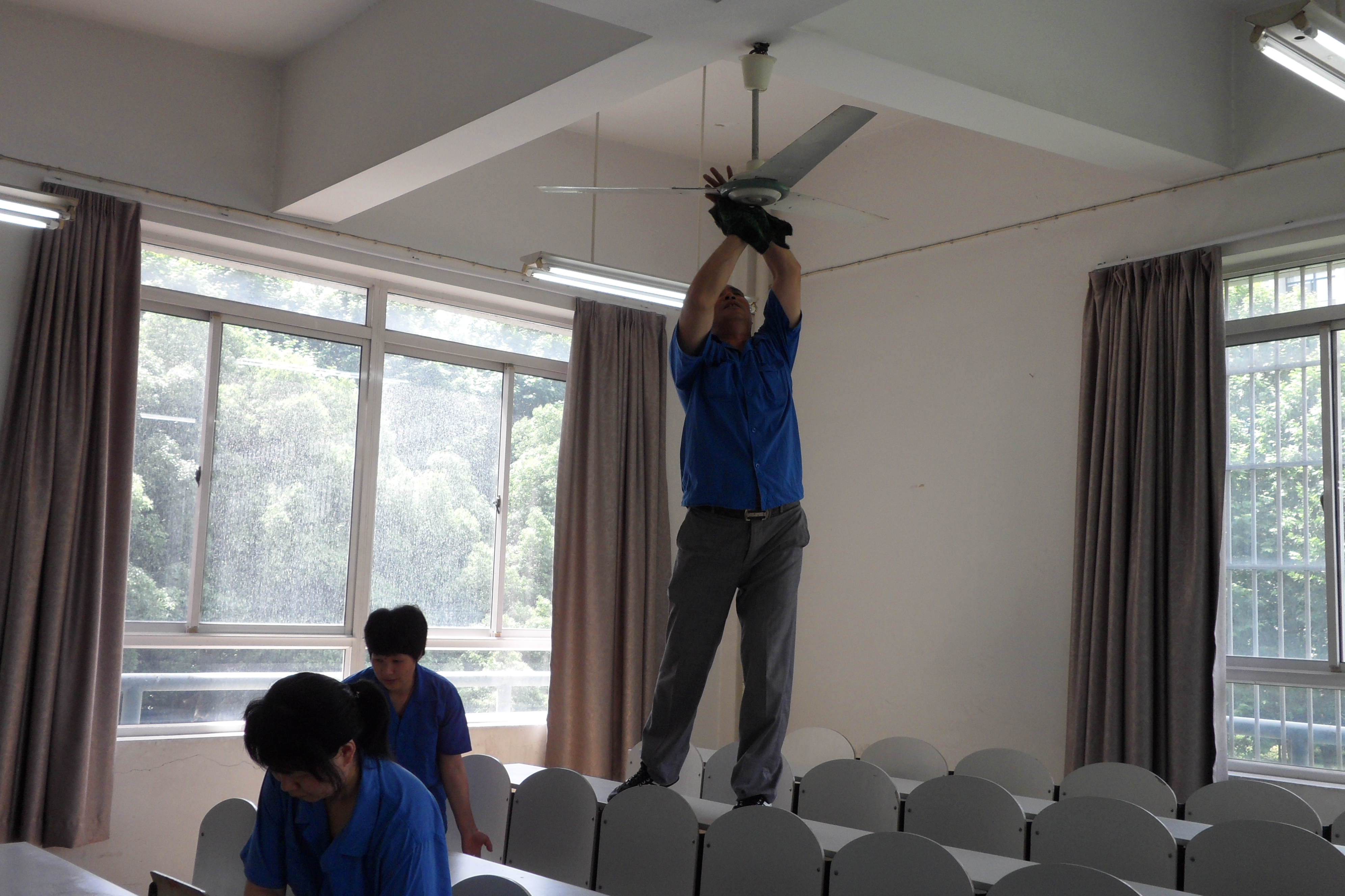 下午开始,根据清洗要求,部门对检查清洗工作进行细致分工,并在清洗过程中,检查了吊扇叶片是否牢固、开关能否正常使用。此次检查清洗工作共用时3天,完成了教学楼229个吊扇的检查清洗,报修故障吊扇4把、故障开关15只。这次检查清洗工作既是对教学楼的一次卫生大扫除,也是心系师生,主动服务的一次体现。