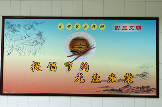 在对灯箱装饰的过程中,中心结合食堂实际工作从多方面入手,融入了“光盘行动”理念,并将近年来在各种大型厨艺比武中的获奖作品以及有代表性的杭帮菜整理上墙,营造浓浓的杭电餐饮文化。