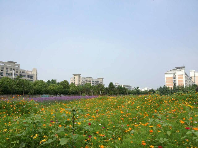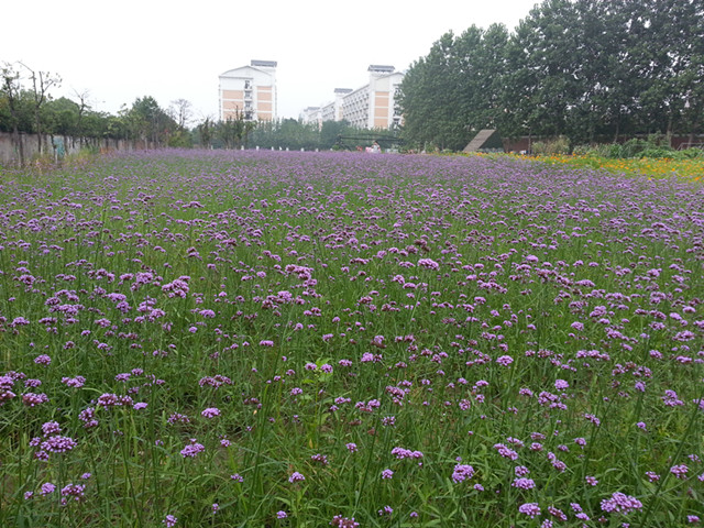在学校万人体育场北侧,大片紫色、粉红、黄色等各色花朵争相绽放,这便是彩化校园之成果--花海。