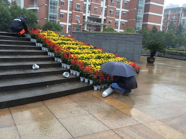 本次摆放草花恰逢台风来临之际,在风雨交加的困难下,中心盆花服务人员穿着雨衣坚持在现场布置摆放,争分夺秒完成环境美化任务。本次摆放草花品种包括一串红、黄帝菊、矮牵牛、孔雀草、菊花等共计4860盆。