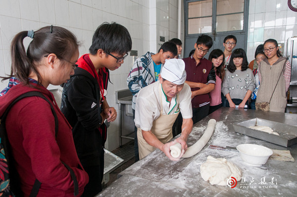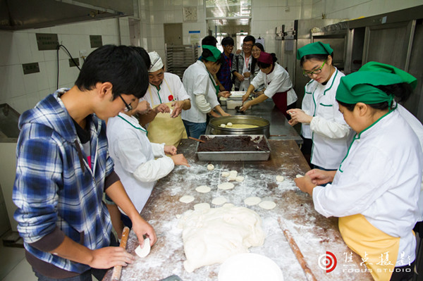 本次“食堂开放日”活动分为“参观食堂”与“做后勤人”两个部分。在“参观食堂”活动中,食堂经理带领同学依次走进食堂各个工作间,讲解餐具清洗消毒过程,菜肴加工的流程、留样菜处理过程以及食品安全管理等方面的知识。参观清真餐厅时,清真餐厅负责人向参观的同学们介绍了清真餐厅的文化、历史、特点等,并积极与同学们交流意见,希望能进一步提高餐厅服务质量,受到同学们的欢迎。 “做后勤人”环节中,同学们分别体验了 “厨师助理”、 “面点师”、“开餐员”岗位的工作,旨在让同学们了解“食之不易、食之艰辛”的用意。