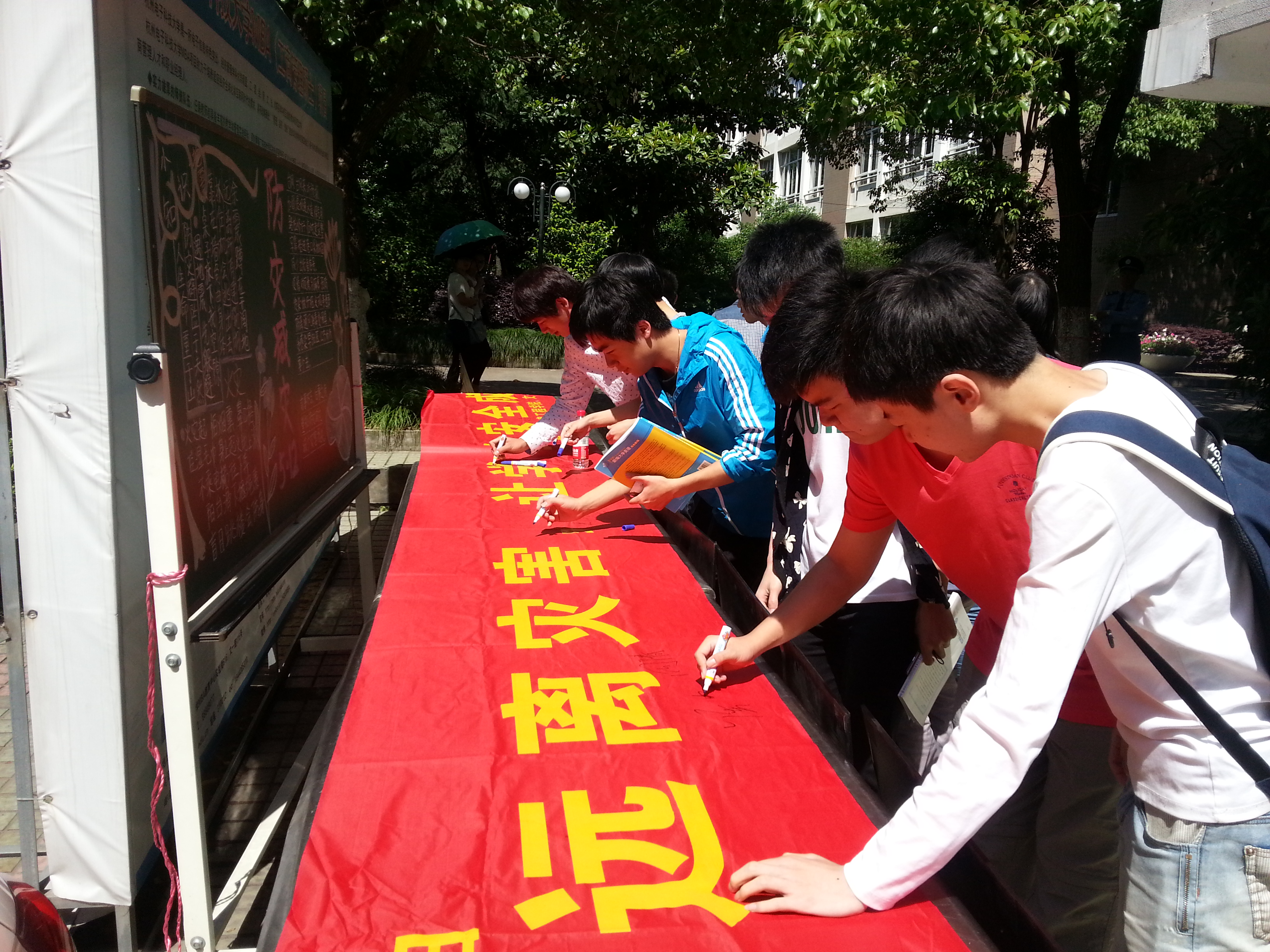 活动主要围绕“让校园远离灾害,让学生安全成长”的主题,制作了有关学生宿舍防火防盗知识、消防避险应急常识以及我们身边存在的消防隐患警示图片等内容的展板13块和黑板报一期。为了达到积极宣传的效果,同学们还在宣传横幅上签上自己的姓名,以表警示。