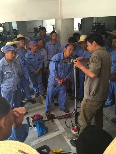 本次培训主要包括日常使用较频繁的割灌机、绿篱机、高枝绿篱机、打药机和油锯等机械。培训过程中,老师对不同机械、操作步骤做了介绍,并列举平时容易出错的环节,分析其不规范的原因并予以纠正,强调了机器使用后的保养方法。同时,着重讲解了高枝绿篱修剪机刀片角度的调整、刀片的维护和打药机压力器的控制。培训现场,多名员工积极参与互动操作。
