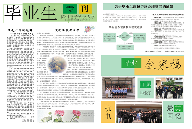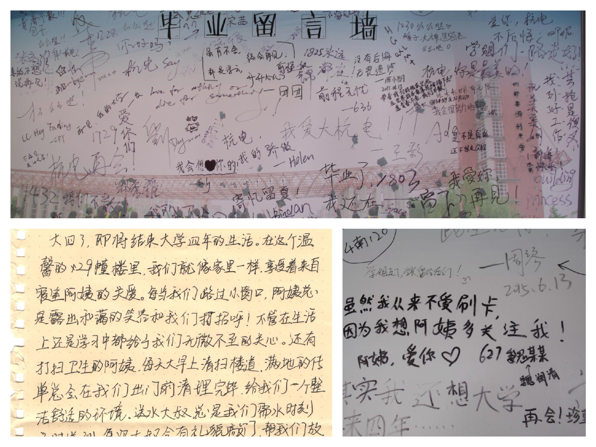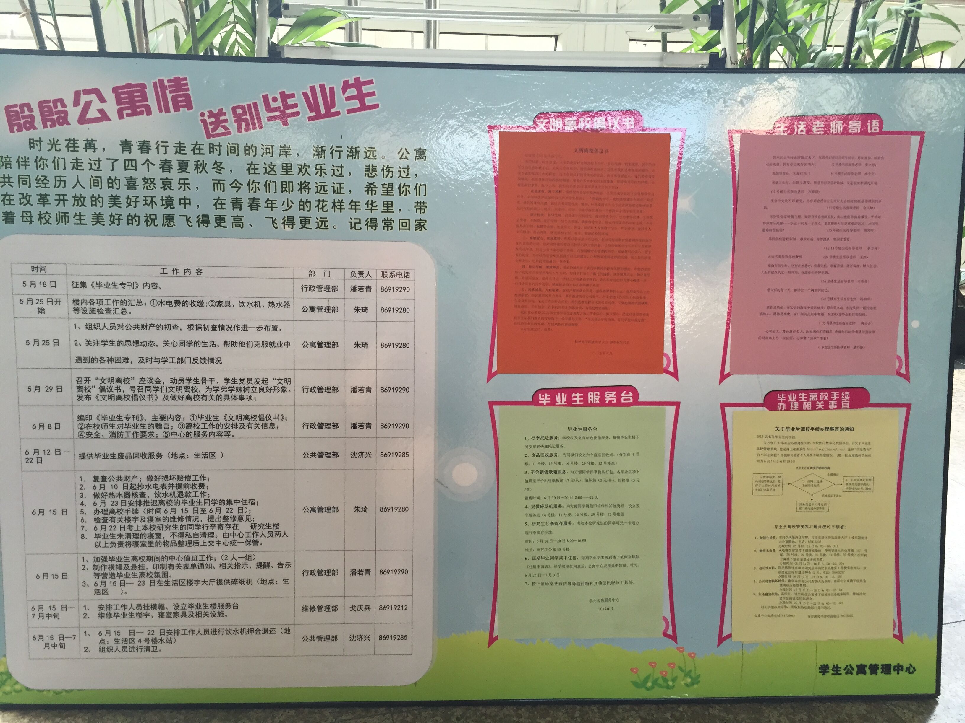 今年6300余名毕业生共分布在11幢楼宇,为保证离校工作文明有序、平安顺利,中心提前启动,多次召开专题会议,制定详细的安排,生活指导老师走进寝室开展设施设备检查,与同学们谈心。中心邀请学工部、保卫处、后勤服务总公司等部门召开毕业生代表座谈会,倡导文明离校,完善配套服务。及时通过微信平台和张贴通知多种形式发布毕业生离校期间公寓服务内容和毕业生办理流程,编制毕业生专刊,楼内设置留言墙、悬挂横幅,拍摄创意全家福。
