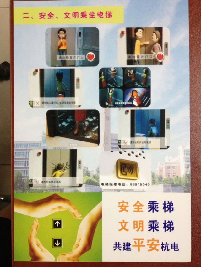9月11日,我校迎来了2015级的新生,为了能让新生们尽早地了解乘梯安全的重要性,我中心派出两名电梯安全管理员早早地等在学生公寓楼内,为学生或家长分发“安全乘梯、文明乘梯、共建平安杭电”的宣传海报,让新生在第一时间了解文明乘梯的重要性,并重点体现学生当碰到电梯故障应该冷静对待,及时拨打校内维修电话:86915040,等待专业人士救援。