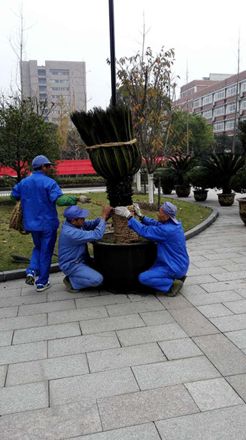 绿化管理部在进行修剪的同时还需完成244棵铁树的保暖养护工作,目前主要采用稻草捆绑保暖护冠的方法,保持树木热量和水分的储藏,帮助树木安全过冬。近期还将完成乔木的涂白工作,通过涂白保护,减小向阳面皮部因昼夜温差过大而受到的伤害,杀死一些越冬的病虫害。绿化工们要抓住短暂的晴天,通过“修剪锯涂绑”完成冬季树木的防寒防冻防病虫害工作,确保来年的优美景观。
