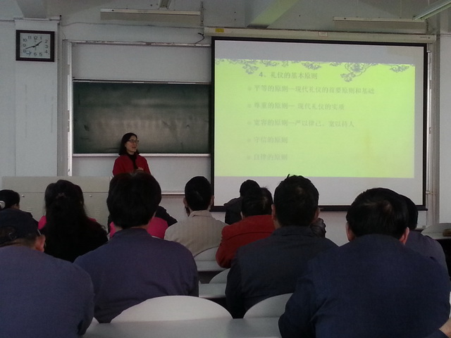 通过培训,目的是让员工们从思想上转变观念,从而在实际工作中提升能力,为广大师生提供优质服务打下坚实的基础。培训结合后勤服务的工作特点,从礼仪的基本原则、对己礼仪、对人礼仪、对事礼仪等四大方面着手,阐述了员工的自我定位、服务的意识和心态、良好职业形象的塑造以及与师生沟通、微笑服务等方面的必要性、重要性。同时,也剖析了哪些不受欢迎的人及缺乏修养或性格缺陷的人在现实中可能出现的种种负面影响。张教授通过实例讲解,图文并茂,深入浅出,使员工在愉快的氛围中受到了教育。