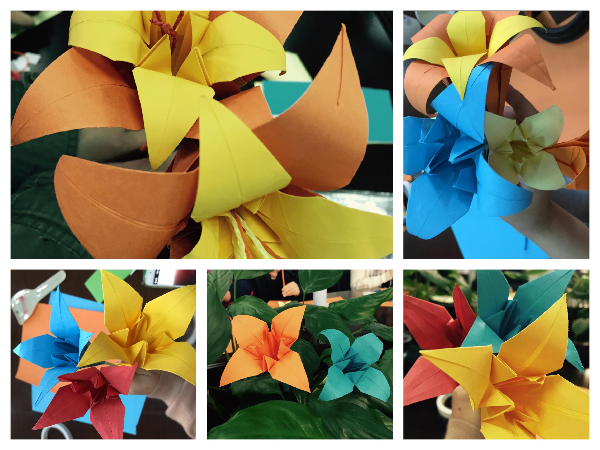 本次手工主要以折纸为主,折纸是一种材料简单、操作方便、效果显著地手工创造劳动,它通过剪、折、粘贴、描绘等手段,巧妙地把纸制成各种生动有趣的形象:如人物,动物,服装,建筑,花卉等,可以有效地培养思维、想象、创造等多种能力。胡同学为大家传授了百合花的折纸方法。他耐心的给大家示范、指导,一步步的带领大家往下折。通过学习,大家在短短的一个小时内折出了栩栩如生的百合花。