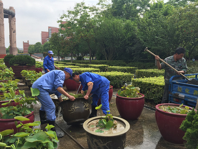 荷花景观规模在扩大,其维护也至关重要。荷叶易生蚜虫,绿化工悉心管护防治;夏季高温时节,龙缸内水分蒸发快,这就要求我们的工人们每天都要及时补充水分,即使辛苦,但看到师生留恋于荷花间或拍照或驻足时,我们还是会露出欣慰的笑。这欣慰也将更鼓励着我们更努力工作,打造维护出更美丽的荷花景观,使校园美如画。不仅将这美留给在校的师生,也将这种美留给这个毕业季。