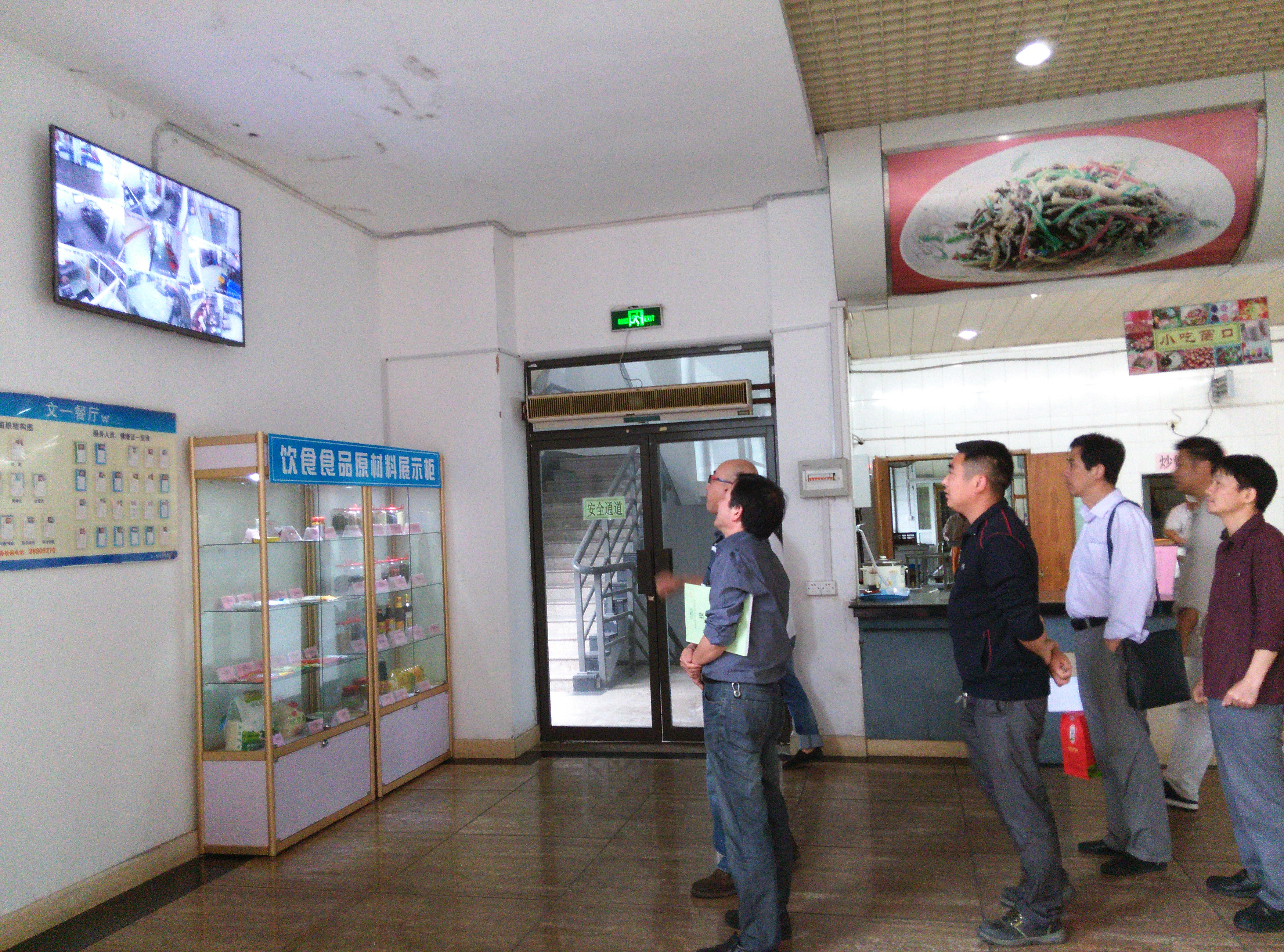 按照“阳光厨房”的建设标准,文一食堂共设置18个点位,分别有:原料清洗切配区、烹饪区、冷菜间、预进间、餐具清洗消毒、库房大门、工作通道、蒸煮间、开餐间等,在食堂就餐大厅安装视频展示厨房内部操作区块画面,并在大厅醒目位置公示餐饮服务许可证、工作人员健康证、食品安全承诺书和饮食原材料展示柜。该系统接入中心管理人员办公电脑予以监督管理。