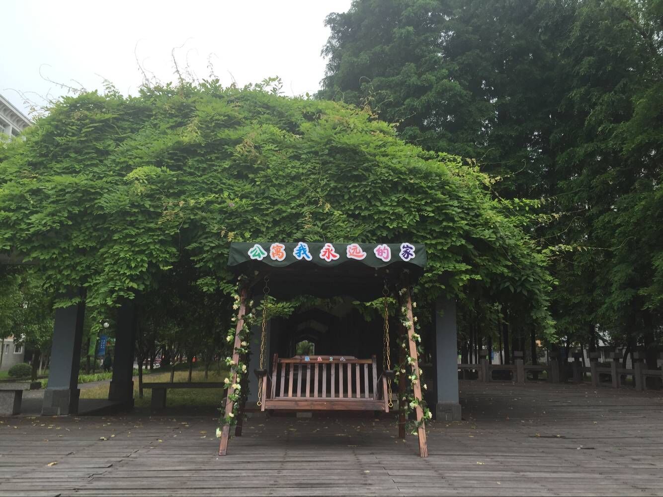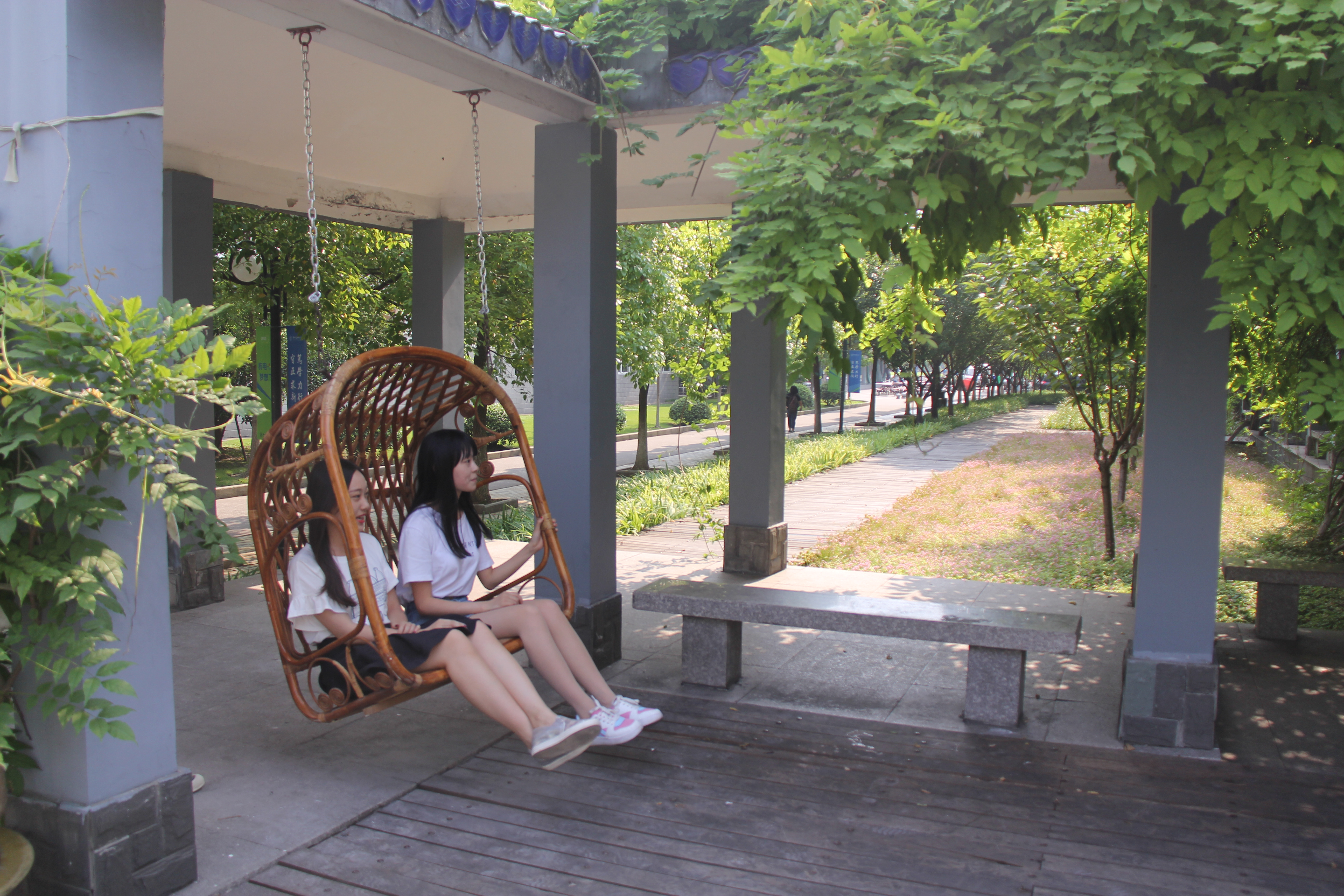 生活区拍照留念点 考虑到大学生活大部分时间是在生活区度过的,这里承载着他们许多美好的回忆。中心在生活区小广场(藤廊寄梦)处精心布置了“公寓 我永远的家”主题公寓生活图片展和毕业留言板,购置了秋千椅,给同学们提供了一个在生活区休闲舒适生活又可以拍照留念的场所。