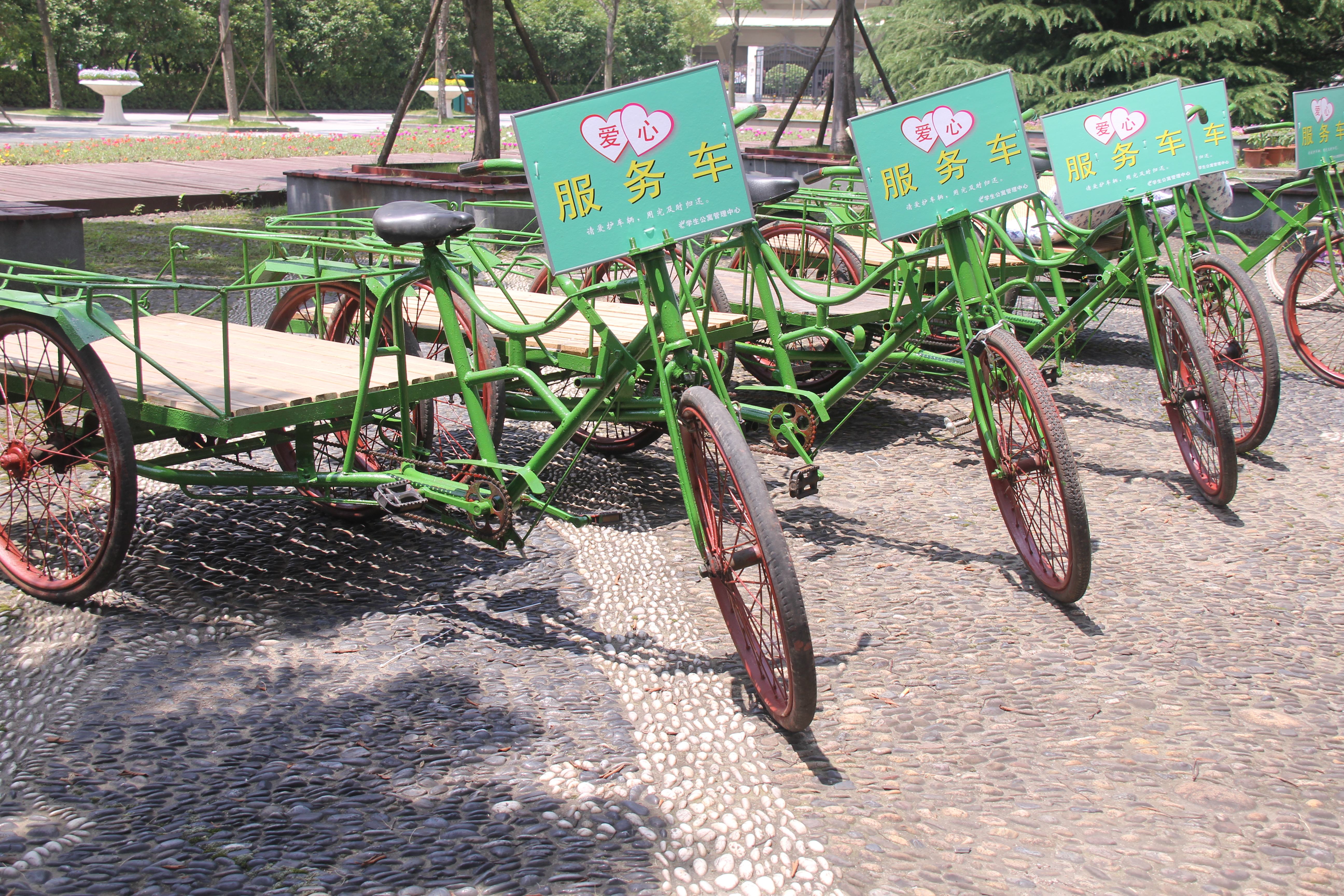 爱心服务车 为方便同学们搬运行李物品,中心将5辆爱心三轮车整修一新,分别放在12号楼、27号楼、28号楼、30号楼、32号楼西。有需要的同学们到以上楼宇值班阿姨处登记即可借用,并且提供专人电话预约服务。同学们反映,一个普通的小小三轮车帮了我们很大的忙,不然大热天搬运这么多行李太吃力了,公寓的服务真的很贴心。