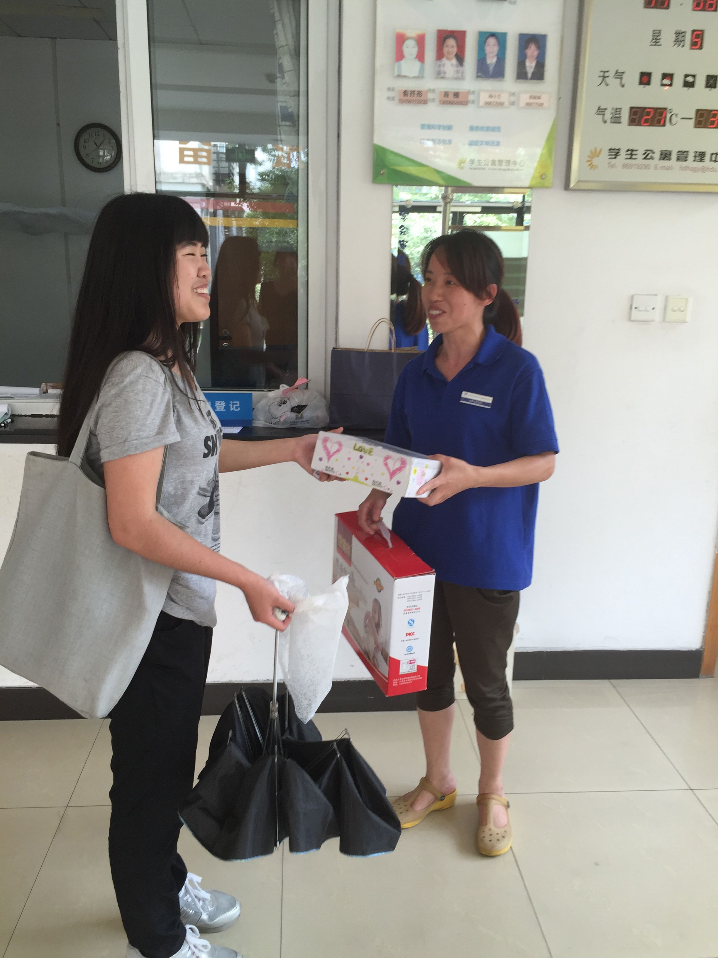 叶玳均,信息工程学院一名毕业生,住在32号楼601寝室,一个特别肯上进的同学,是今年的省优毕业生。从值班员郭丽娟那里了解到,她平时学习比较忙,没有特殊事情几乎从不麻烦阿姨,只是在进出楼的时候偶尔和阿姨打声招呼,没想到在即将离开的时候,特意带了礼物送给阿姨,以此来表达她对阿姨这四年来的陪伴和帮助。阿姨收到礼物的时候都很惊讶,因为她自己也不知道做了什么特殊的事情,小郭说她只是做了自己应该做的。