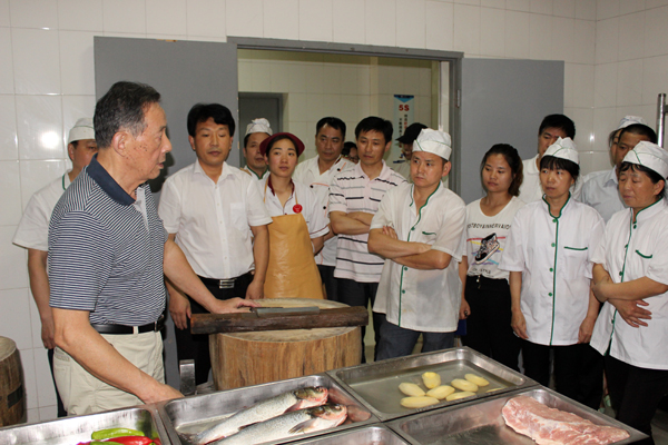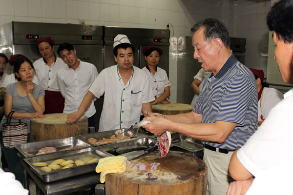 束老师结合我校食堂的基本情况,从餐厅员工的工作实际出发,对切配工作中墩头的使用、刀的养护、刀法、刀工、切的手法、切配过程中注意的事项、配菜的成本核算等方面向培训人员进行了详细讲解,同时还进行了现场操作示范。束老师的语言通俗易懂,培训人员受益匪浅。会后,学员们就自己日常工作中出现的问题和束老师进行了亲切的交流和探讨。