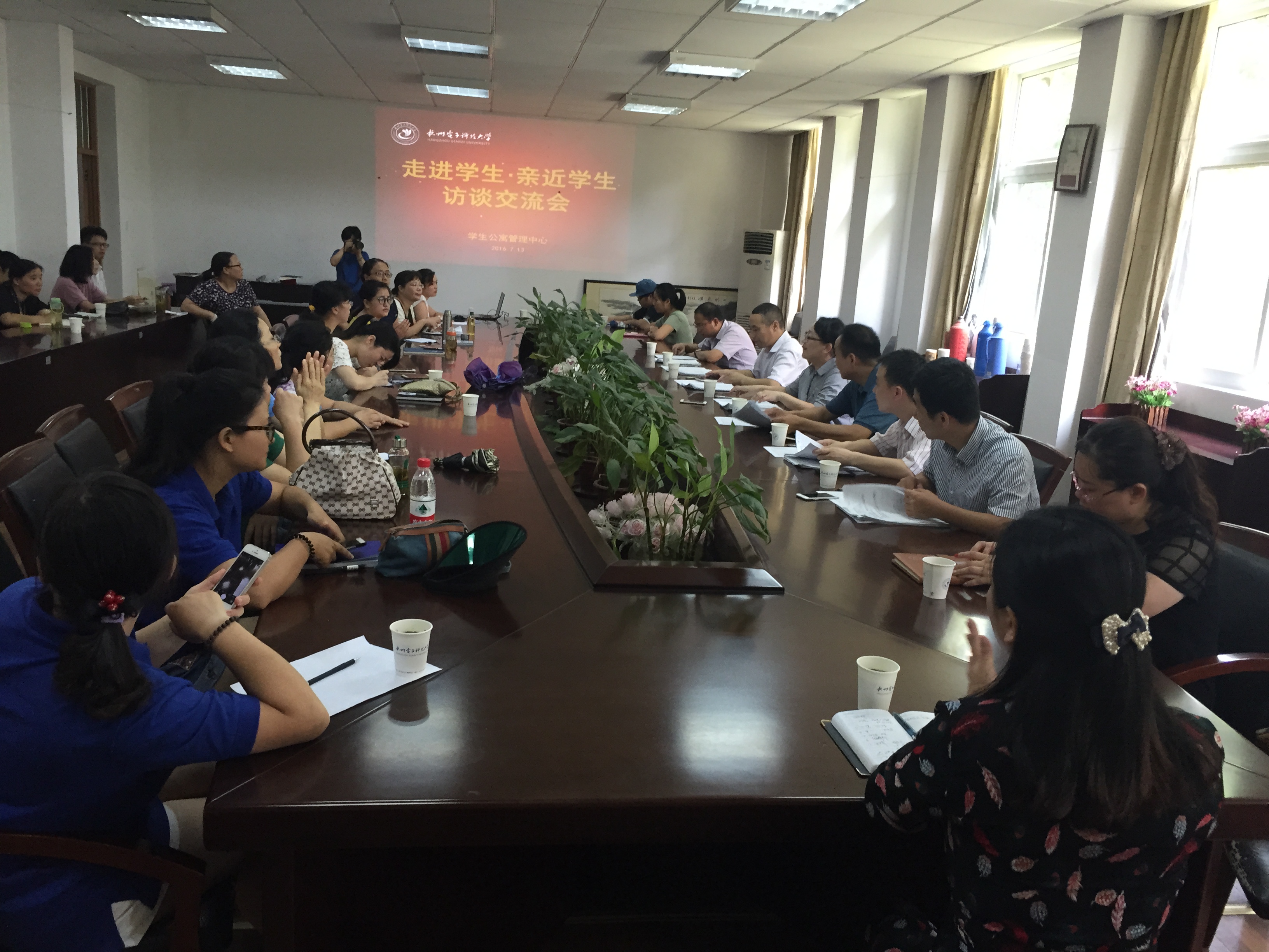 7月13日上午,学生公寓服务中心在22号楼会议室召开“走进学生 亲近学生”访谈交流暨半年工作总结会。学工处处长钱波、部分学院书记、学工办主任以及公司董事长李中昌、总经理王文虎应邀出席会议,中心生活指导老师以上20余人参加此次会议,会议由中心主任林小惠主持。