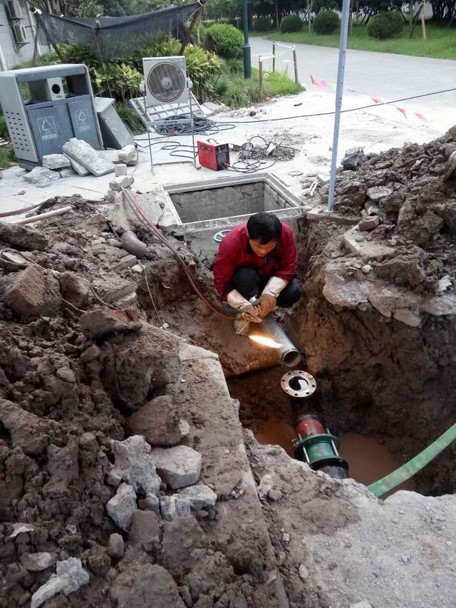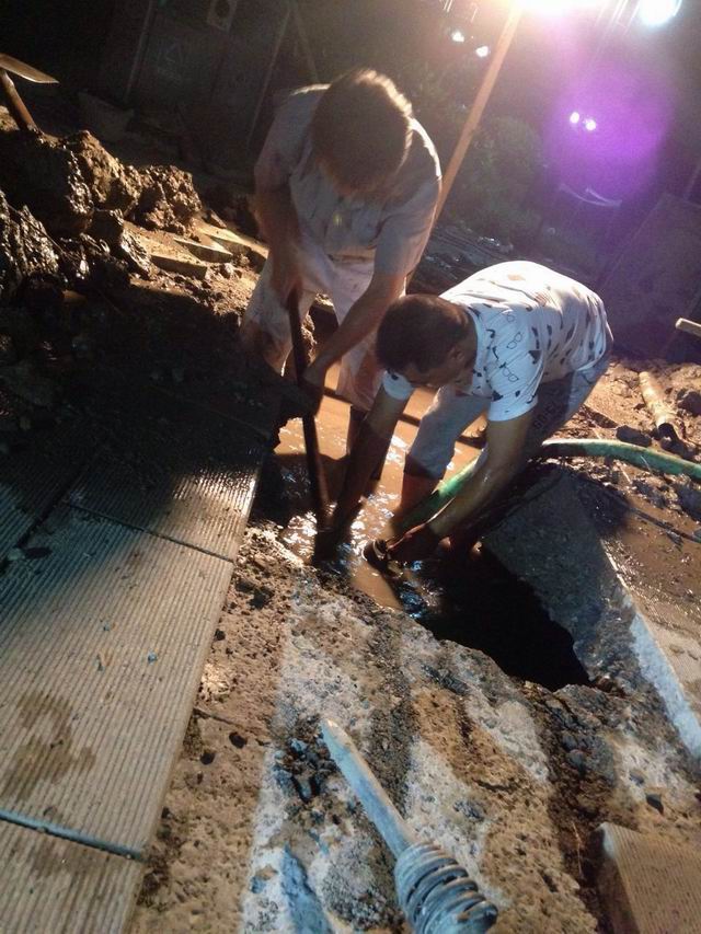 经过排查,确认漏水点在马路的中间,必须清除马路上的道块和开挖混凝土垫层才能找出漏水点,抢修任务非常重。为了尽可能减少停水对留校学生造成的影响,中心领导决定连夜进行破马路找出漏水点,这样可以大大缩短抢修时间。在昏暗的灯光下,维修人员们开始搬道块、破马路、抽水,终于在晚上11点找到了漏水点。第二天,室外温度高达四十多度,水工、电焊工、泥工们交替上阵,身上的汗水打湿了衣裳,脸上的汗珠更是顾不上擦,他们全身心投入抢修工作,终于在25日下午2点完成了抢修,生活区供水恢复正常。