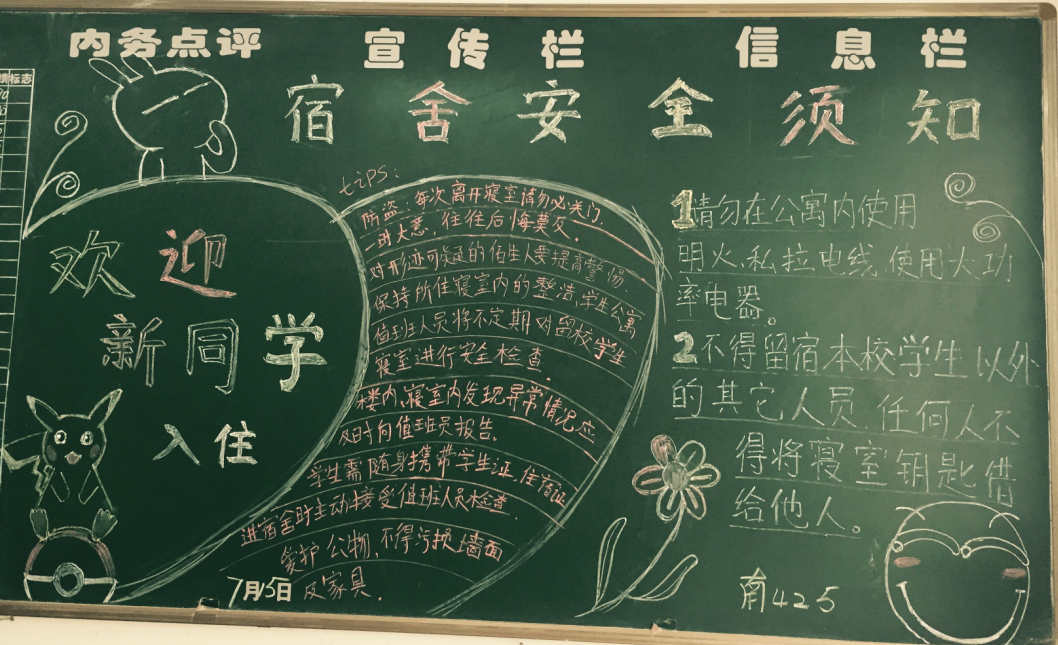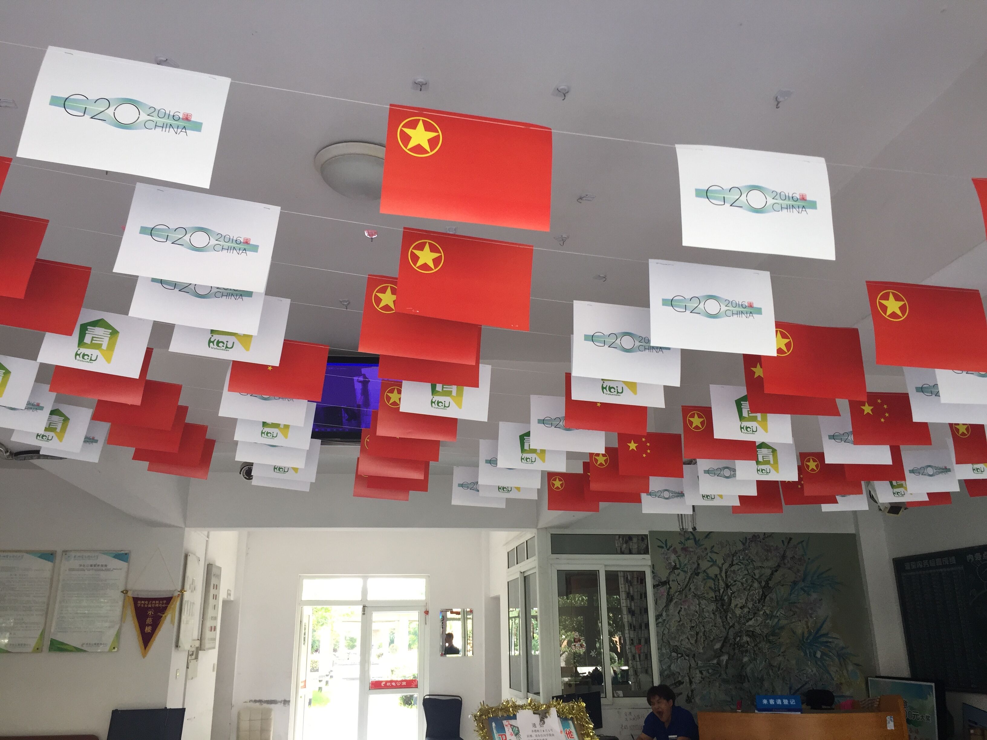 根据前期安排,8月15日已经全部完成搬迁工作,研究生也已集中到本部住宿。截止8月17日,本部留校女生179人,男生109人,共计288人(其中志愿者259人,非志愿者29人)。研究生公寓留学生40人。为保证住宿安全,入住后中心及时统计学生信息,将名单导入门禁系统,要求同学进出楼要刷卡。为了营造G20氛围,特意在楼内刊出黑板报,与青协一起悬挂了绘有G20标志的小旗帜。