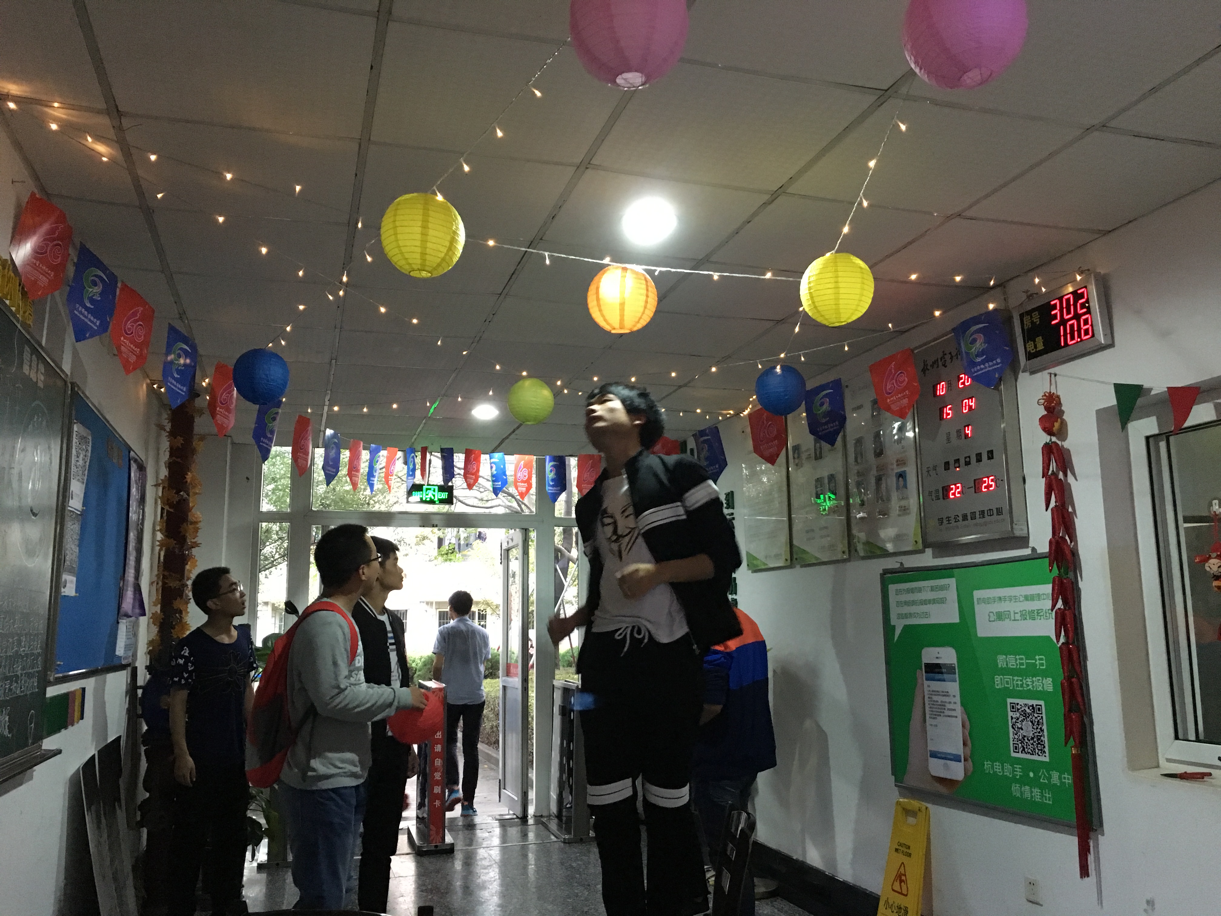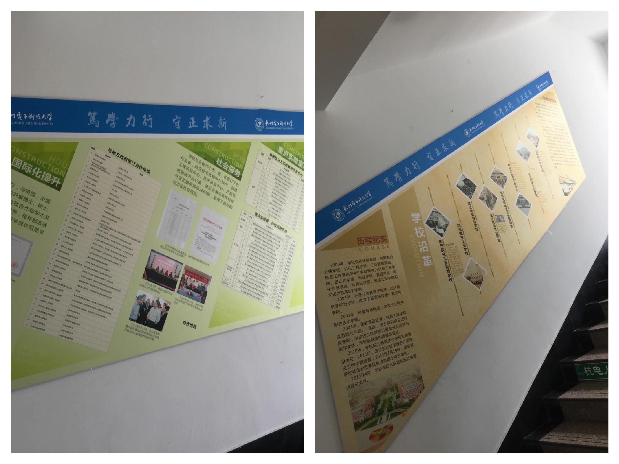 为了在楼内营造校庆氛围,让校友回到公寓楼后也能感受到学校的历史气息,中心在假期精心收集资料,将杭电发展史、校训释义、知名校友等内容制作成KT板,装点楼道。各楼特意对大厅进行了装扮,设计并制作校庆专题的吊旗和灯笼作为主要的饰品来美化大厅,同时开展校庆主题板报评比。除此之外,还充分利用大厅的电子显示屏,将校庆系列活动的主题、内容以及时间等进行显示,为校友活动提供便利。