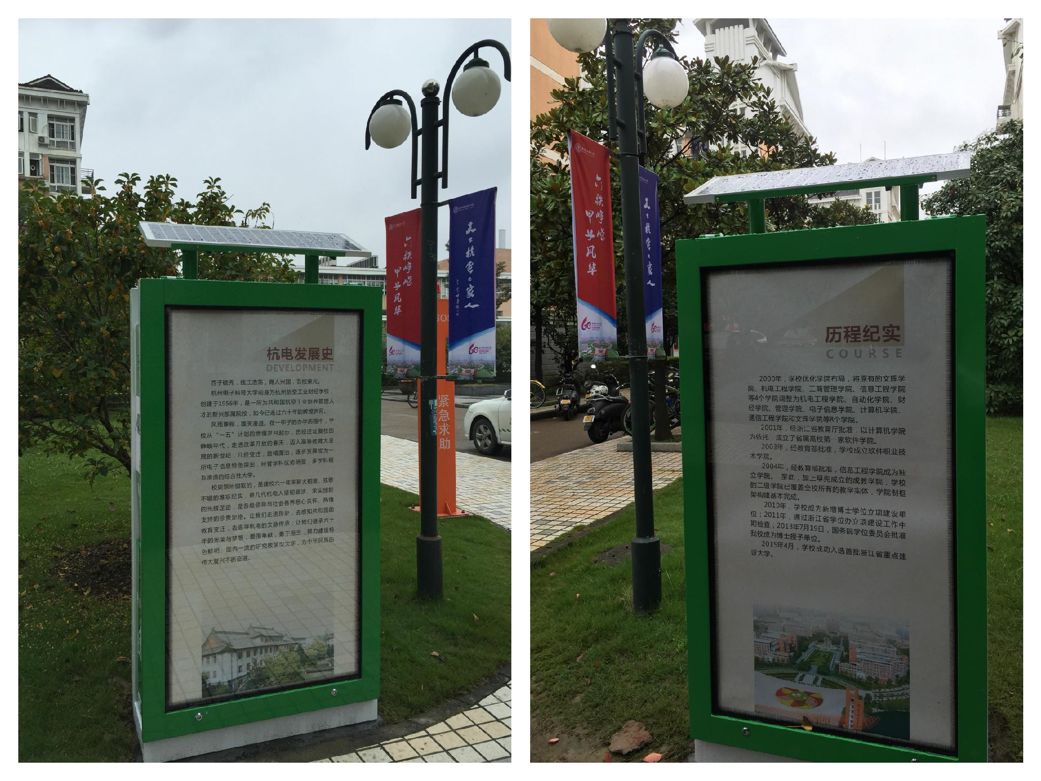 除了楼内,在生活区的主干道旁还新设置了18台太阳能果壳箱,将学校沿革、历程纪实以及欢迎校友回家等内容统一设计后安装在果壳箱的正面,为校庆增添了一抹亮色。同时在生活区的藤廊寄梦处,为校友设置了合影留念点。