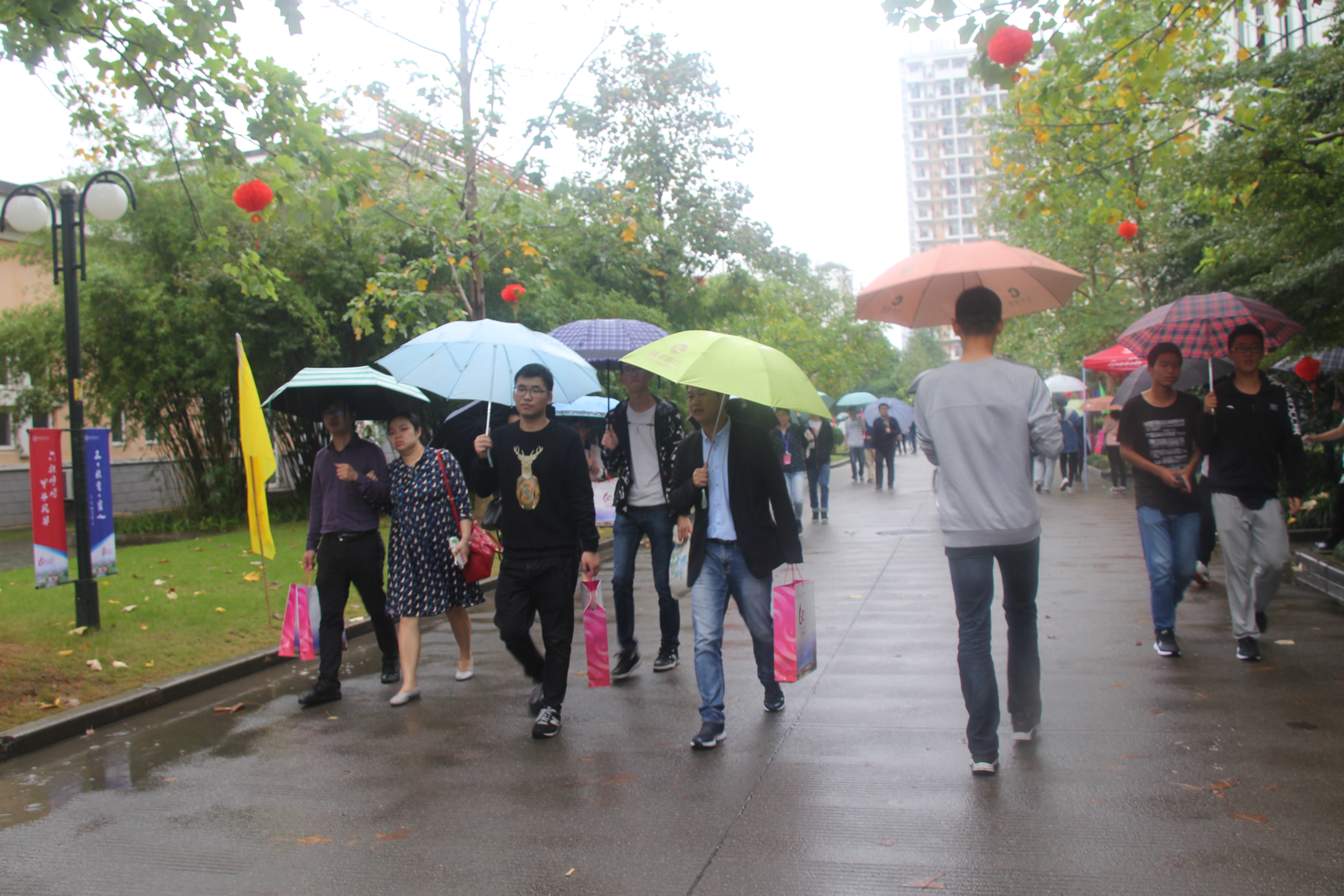 校庆当天,虽然秋风瑟瑟,寒意袭人,但学校依然不减校庆的红火气氛。生活区主干道上插满了彩旗,树上挂满了大红灯笼,连因被雨水浸润而平整地摊铺在黑色柏油路面上的枯黄树叶都散落得那样美丽。