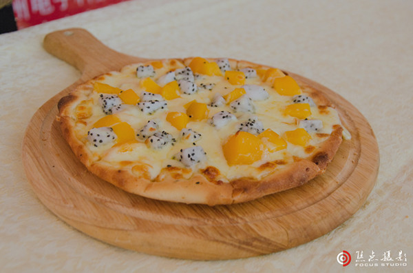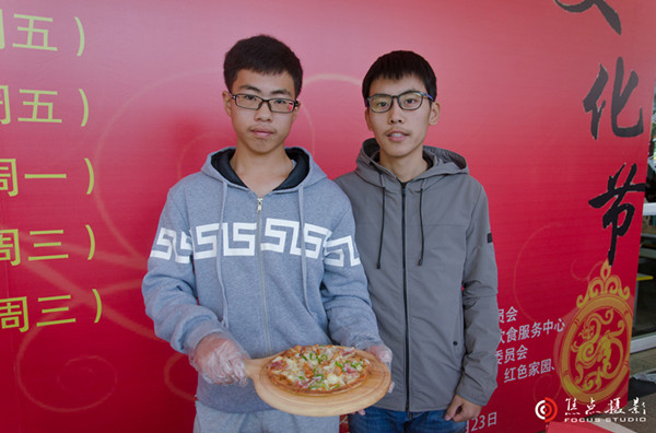 本次饮食文化节参与披萨制作的同学都是经过现场和网络报名挑选出来的。组织方向每个参赛队提供了未经加工的披萨、奶油、水果及各种工具,选手们可以在组织方提供的材料中自选,也可以使用自己准备的食材,在30分钟内发挥创意,制作出个性而美观的披萨。工具和原材料在制作者手上被运用的游刃有余,现场异常热闹。制作好的披萨各具特色,倾注了选手们独特的感情和创意,令现场观看的同学赞叹不已。