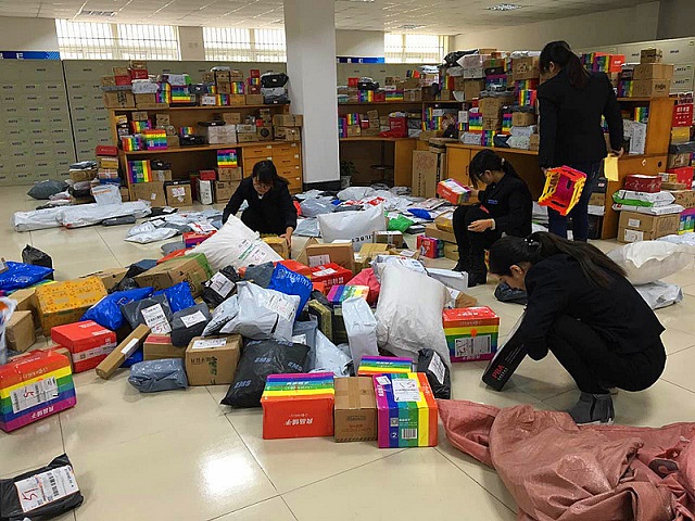 一年一度的“双十一”购物狂欢后,收发室进入了紧张的工作状态。从11月12日起每天收到包裹大约五、六百个,较平时邮件数量增加了几倍。收发员不停地拆封运输袋、清点数量、做标记、整齐堆放。课间和中午是领取包裹的高峰期,为了减少学生排队等待时间,同时安排五个收发员为学生办理领取。