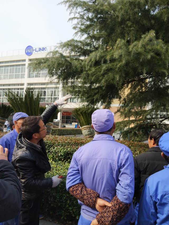 沈老师重点讲解了黄山栾树、五针松、石榴、雪松等几个常规品种树木的修剪方法,并通过现场示范的方式分析了不同修剪方法与技巧之间的特点及修剪中注意的问题,对树木因树龄、因时、因习性等进行整型修剪,除弱枝、病枝、枯枝,保持树木健壮、协调生长。随后他结合现场植物,边示范边讲解,边讲解边操作,随时解答员工提问。他那熟练的修剪技术、实用的授课方式和仔细的讲解,得到员工好评。