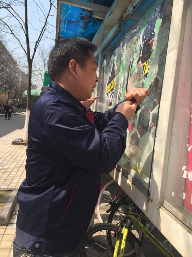 在活动现场,党员志愿者们提着水桶,拿着小铲刀、铁刷、抹布,主要清理了路边的信息宣传栏、电线杆等处的小广告。他们两人一组,有的喷水,有的用手撕,有的用铲刀用力清除,大家干的热火朝天。经过两个小时的清理,生活区内多余处小广告集中区被清理干净、焕然一新,党员们忙碌认真的身影也赢得了学生们一致夸奖和赞许。党员们在清理“牛皮癣”的同时,还向学生宣传,希望大家齐心协力,共同整治这些不文明现象,把生活区建设的更加文明有序、环境优美。