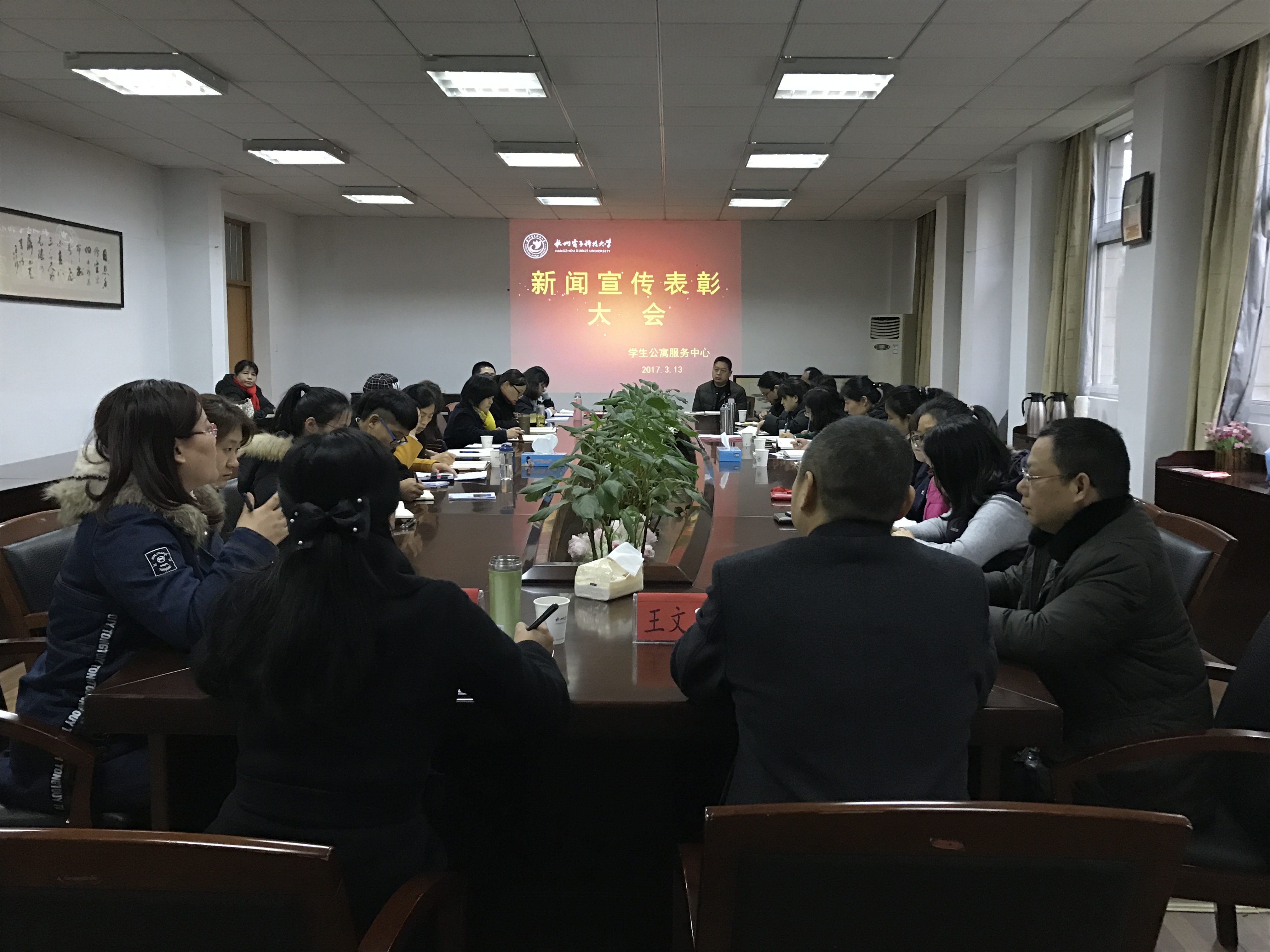 3月13日上午,学生公寓服务中心2016年度信息宣传总结表彰会议在中心会议室举行。文一公司总经理王文虎、中心生活指导老师以上管理人员参加了会议,会议由中心副主任杜鹃主持。