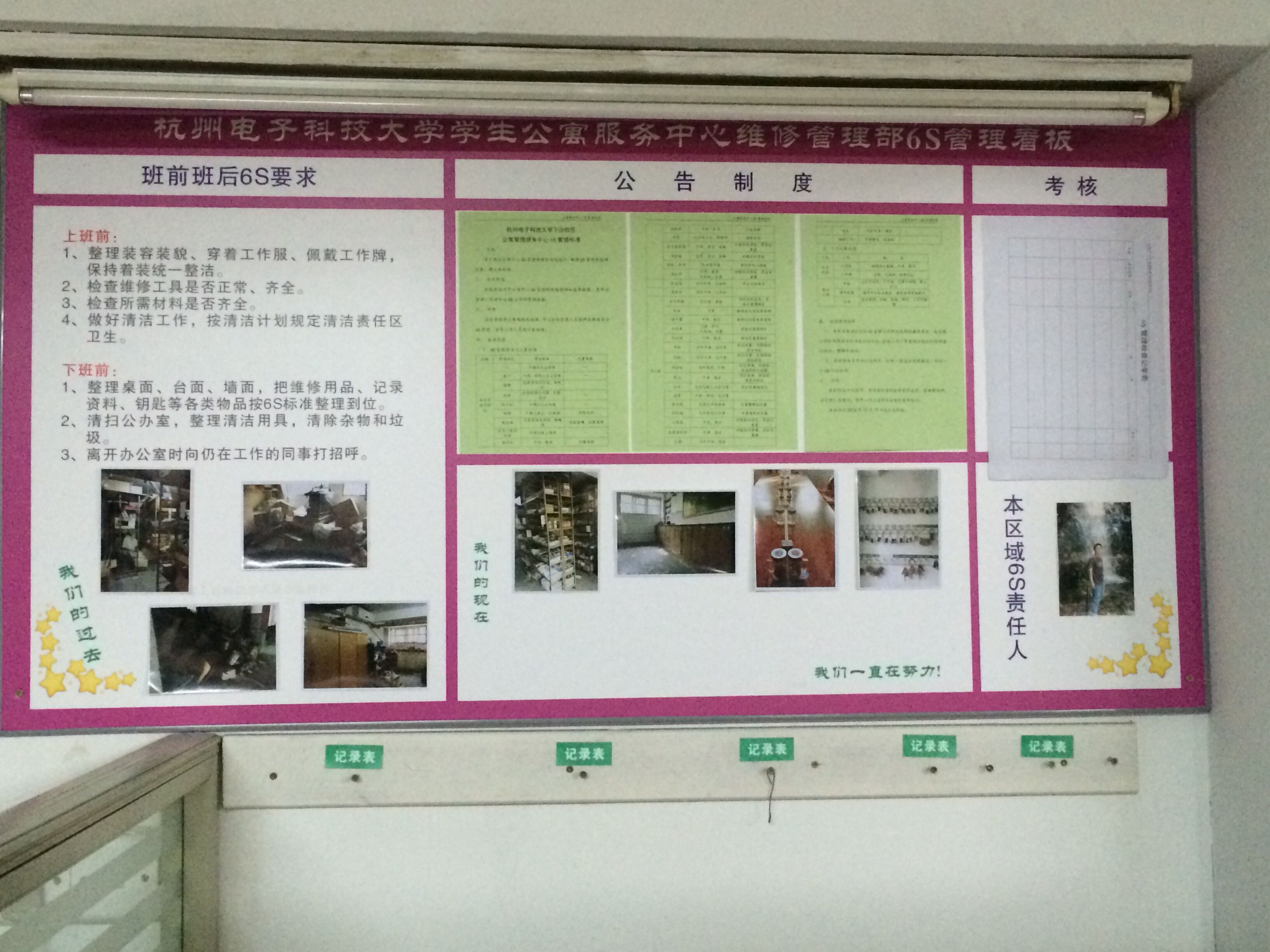 学生公寓每月进行一次流动红旗检查评比工作。为营造6S管理工作的氛围,楼宇各大厅、维修部、公共管理部都制作了6S管理看板等物品,生活区处处洋溢着6S管理的良好氛围。6S管理流动红旗每月评比工作促使现场基础管理工作得以提升,其中以维修管理部最为明显。该班组以前配件多而杂,工作环境差。但维修部克服畏难情绪,上下一心,全员彻底整理、清扫、清洁,有效改善了工作场所凌乱、无序的状态,强化了文件、工具、物品的管理,提升了员工的行动能力和素质,增强了班组的凝聚力,整体提升了维修管理部管理水平,从而跻身6S管理流动红旗之列,实现了脱胎换骨的变化。
