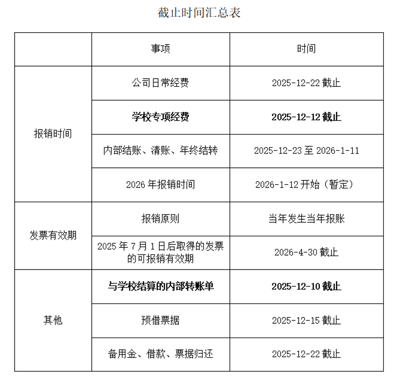 1.公司财务报销截至2025年12月22日。(特别提醒:纳入本年度预算的专项维修工程、固定资产采购等支付款项请尽快取得发票,在报销截至日前通过每刻报销进行预约并同步将票据送至财务报销大厅,预算不跨年结转,会影响支付。)