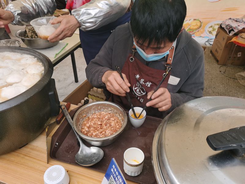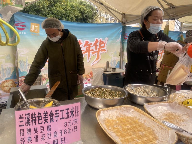 活动现场,各色摊位井然列阵,香气四溢,种类涵盖了省内11个地市的经典美食,尤以兰溪美食为甚;现场展示了包括肉沉子、豆腐汤圆、老林鸡子等多种兰溪非遗美食的制作过程,向同学们弘扬地方美食文化;