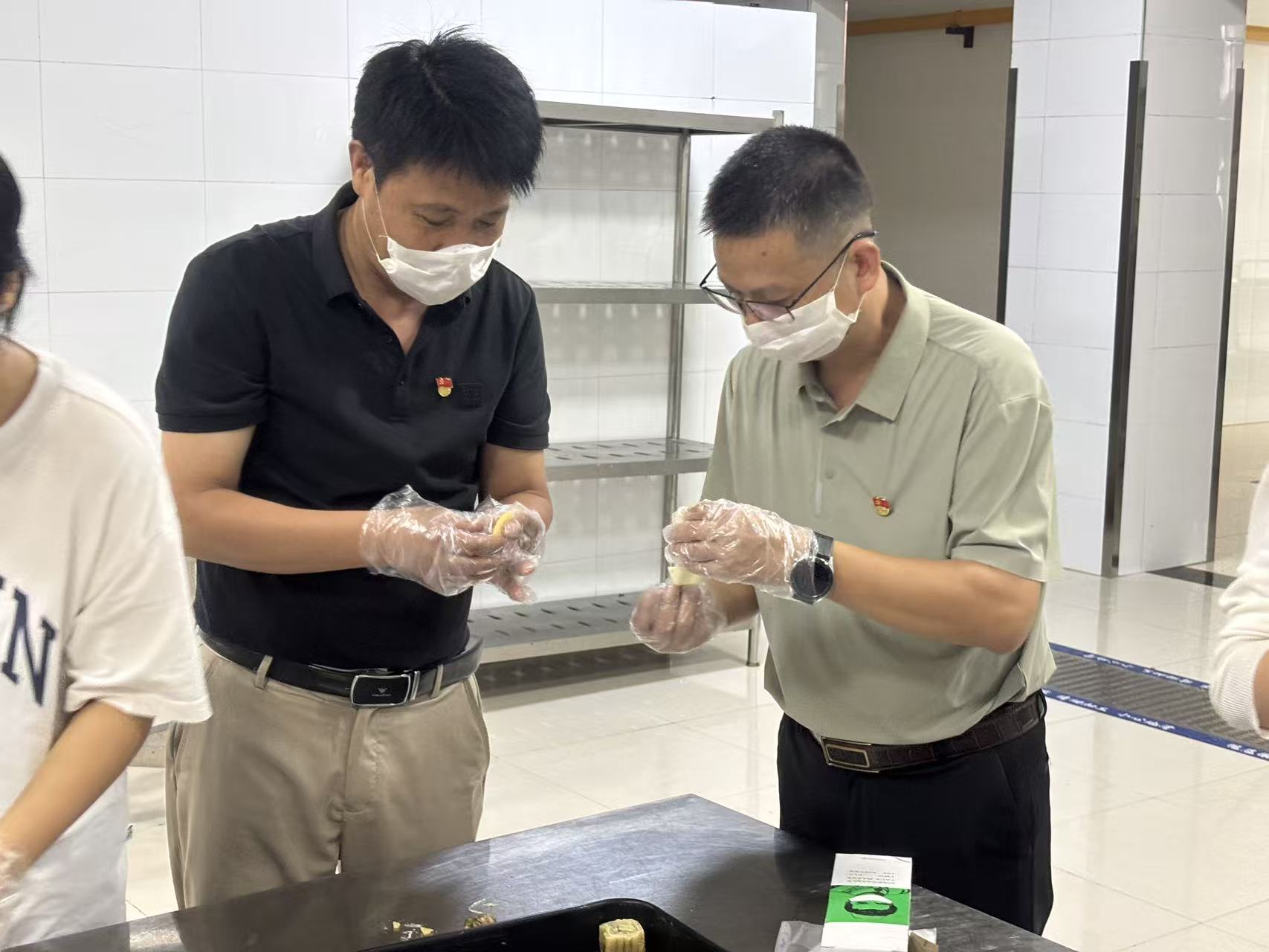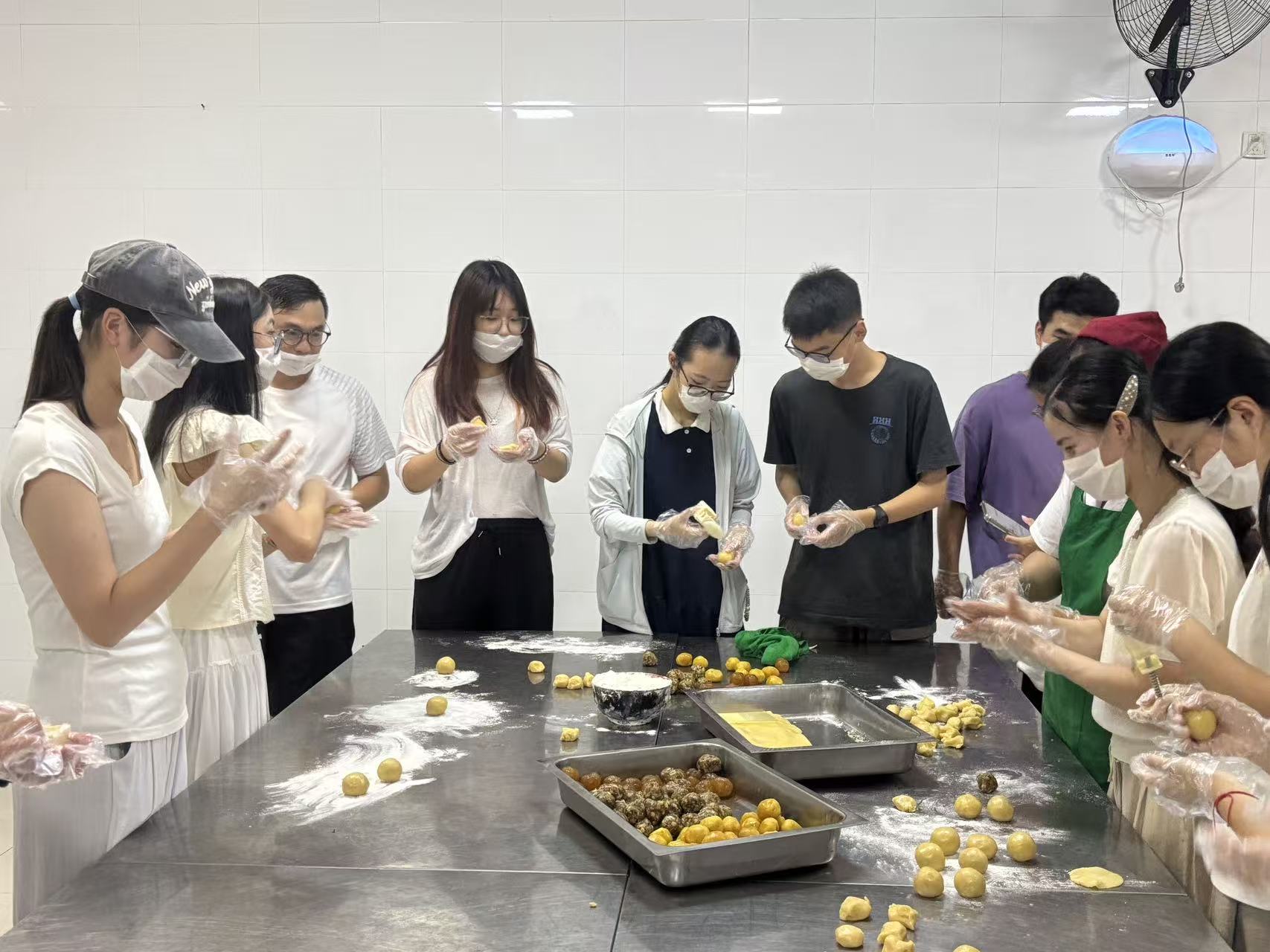 活动现场,面点师傅首先详细讲解月饼制作全流程,从面团揉制的力度把控、馅料分配的精准配比,到包馅时的手法技巧、模具压制的规范操作,每个细节都进行耐心示范与细致指导。师生们专注聆听、认真学习,很快投入实践操作。大家自发分组协作,相互分享经验、互帮互助,现场欢声笑语不断。待烤箱开启,金黄饱满的月饼新鲜出炉,浓郁香气弥漫全场,众人有序分发品尝,酥脆外皮搭配饱满内馅,美味在口中散开,幸福感与归属感满满。