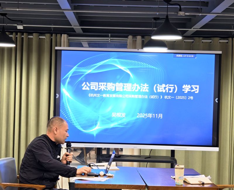 会上,吴根发就《杭州文一教育发展有限公司采购管理办法(试行)》(以下简称《办法》)的职责分工、方式标准、审批公告、实施程序、项目验收等内容进行传达学习,同时针对《办法》修订前和修订后变更的条款进行详细解析,确保《办法》执行到位、落实到位。