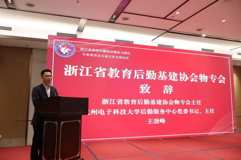 王劲峰代表浙江省教育后勤基建协会物专会致辞,祝贺四川物专会五届五次全会召开,点赞四川高校物业“四川经验”。他分享浙江物业标准化、智慧化等实践,倡议浙川深化合作,共探高校物业高质量发展新路径,助力后勤服务再上新台阶。