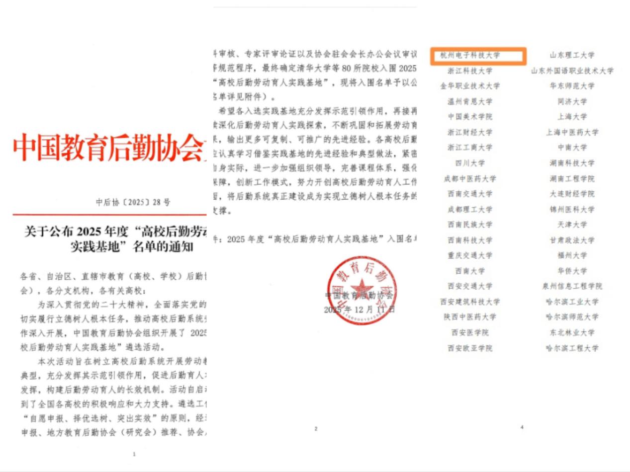 12月12日,中国教育后勤协会正式发布2025年度“高校后勤劳动育人实践基地”入选名单,杭州电子科技大学凭借扎实的劳动教育实践成果成功入选,成为全国80所入选高校之一。