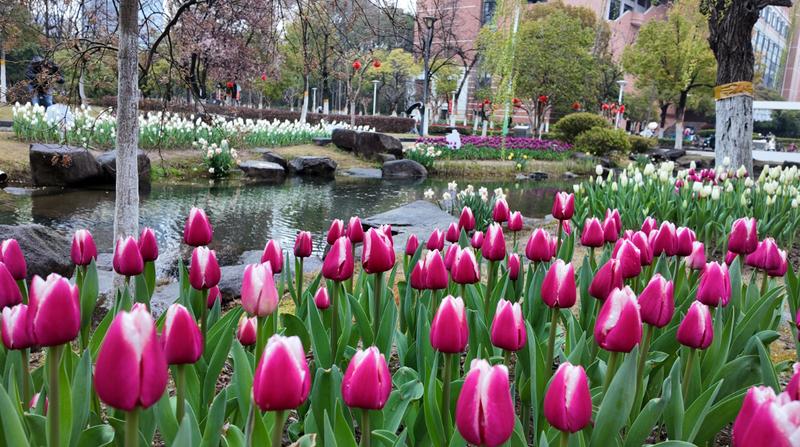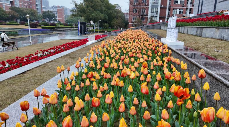 王术海说,今年在杭电赏郁金香,还可以去前沿科学技术研究中心楼前的广阔台阶花圃上,学校首次在这里种植郁金香,总数为21000株。