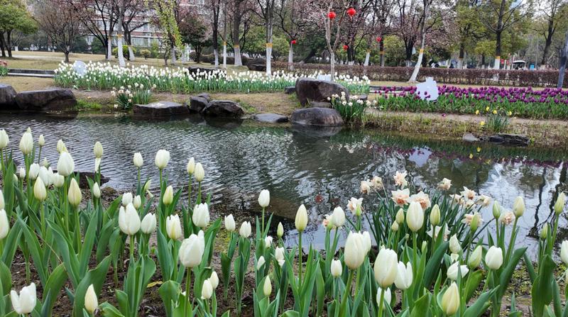 被师生“宣传”的杭电郁金香花带,位于该校下沙校区教学区三教北边的水系沿岸。