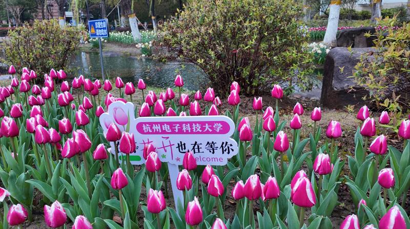 这几天,杭州电子科技大学(以下简称“杭电”)的郁金香盛开了,不少师生都在社交媒体上晒起了图片。有学生将花海形容成“红黄粉紫白等绚烂色彩铺就的浓烈如生命的大片调色板”。