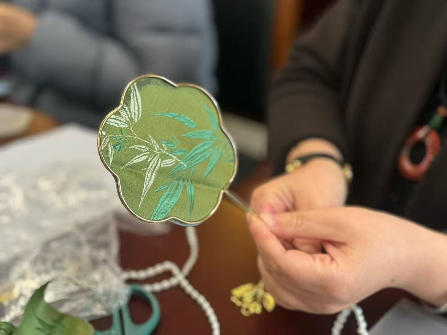 活动伊始,现场便洋溢着轻松愉悦的氛围。指导老师首先为大家生动讲述了宋锦跨越千年的历史渊源及其珍贵的非遗价值,并细致演示了从面料甄选、图案裁剪到拼接缝制的每一个步骤和技巧。在随后的动手实践环节,平日里专注于教学科研、管理服务的老师们,纷纷化身为专注的“手作匠人”。在指尖的轻舞飞扬间,原本平铺的宋锦面料,逐渐幻化成为一面面精巧别致的手工团扇镜。